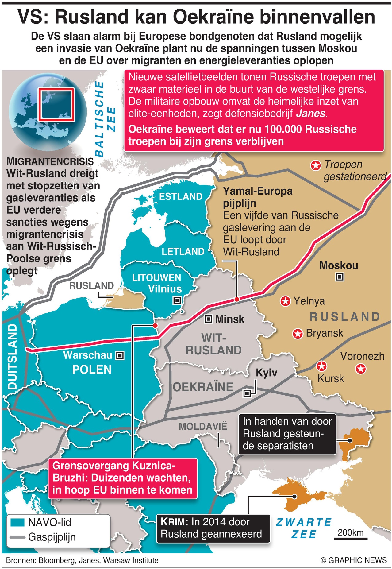 De Verenigde Staten (VS) slaat alarm bij de bondgenoten van de Europese Unie (EU) dat Rusland een mogelijke invasie van Oekraïne overweegt, nu de spanningen tussen Moskou en de EU over migranten en energieleveranties hoog oplopen.