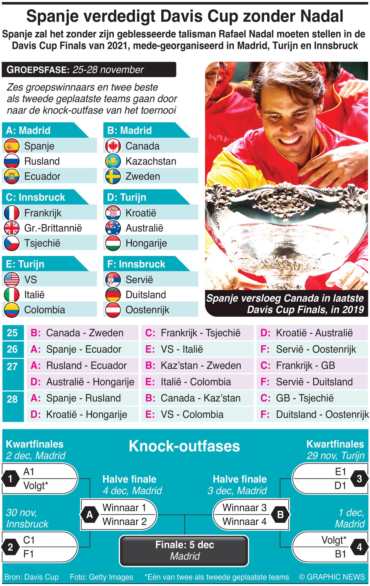 25 november 2021 – 5 december 2021 – De Davis Cup is de belangrijkste internationale teamcompetitie in herentennis, gelanceerd in 1963. Spanje, de titelverdediger, zal het zonder hun geblesseerde talisman Rafael Nadal moeten doen in de Davis Cup Finals, mede-organisator dit jaar in Madrid, Turijn en Innsbruck.