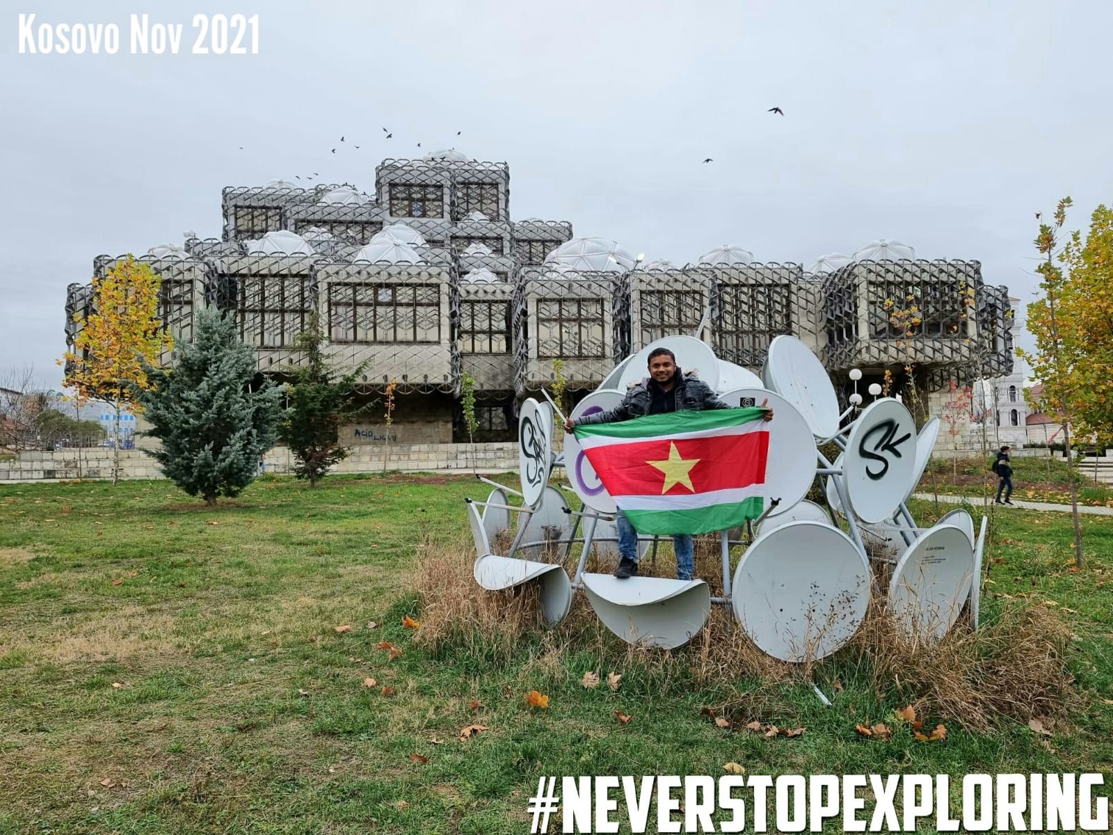 “Het gaat om personen met een heel warm karakter, anders dan men gewend is in West Europa. De standaarden zijn ook veel lager, zodoende is alles veel goedkoper daar. Vanwege het korte bezoek deze keer geen foto op een berg met de Surinaamse vlag maar bewust gekozen voor een bezienswaardigheid in Pristina. Op de foto sta ik voor de Nationale bibliotheek van Kosovo. Het wordt gerekend tot één van de lelijkste gebouwen ter wereld. Mijn eigen mening en wat velen ook vinden is, dat het juist een mooi gebouw is. Het doel van reizen nu is om het continent Europa af te maken. De EU-landen zijn al aangedaan, rest nog zeven landen na Kosovo. Het reizen is nu mogelijk, maar niet zoals in normale omstandigheden. Dit is een reden om nu geen reizen buiten Europa te maken. Het reizen met de Covid-situatie kost extra voorbereidend werk, vooraf onderzoek betreffende Covid-19 maatregelen en formulieren invullen. Het gevaccineerd zijn maakt het stukken makkelijker, uiteraard is het ook steeds rekening houden met welke beperkingen er zijn in het land van bestemming”, vertelt de wereldreiziger.