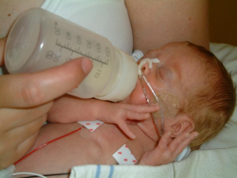 “Als een baby voor de 33ste of 34ste week van de zwangerschap geboren is, zal het zuigen aan de borst of van de fles meestal niet veilig verlopen. Daarbij heeft zo’n kleintje vaak nog niet de kracht om voldoende voeding tot zich te nemen, waardoor sondevoeding noodzakelijk is. De kans op verslikking en benauwd raken is groot, waardoor hij een longinfectie kan oplopen. Tot die tijd zal de baby via de sonde gevoed moeten worden.”