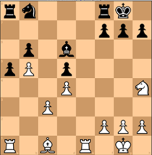 1.e4e5 2.Nf3 Nf6 3.Nxe5 d6 4.Nf3Nxe4 5.d4 d5 6.Bd3 Bd6 7.O-O O-O 8.c4 c6 9.Re1 Bf5 10.Qb3 Qd7 11.Nc3Nxc3 12.Bxf5 Qxf5 13.bxc3 b6 14.cxd5 cxd5 15.Qb5 Qd7 16.a4 Qxb5 17.axb5 a5 18.Nh4 g6 19.g4 Nd7 20. Ng2 Rfc8 21.Bf4 Bxf4 22.Nxf4 Rxc3 23.Nxd5 Rd3 24.Re7 Nf8 25.Nf6+Kg7 26.Ne8+Kg8 27.d5 a4 28.Nf6+ Kg7 29.g5 a3 30.Ne8+ Kg8 31.Nf6+ Kg7 32.Ne8+ Kg8 33.Nf6+ 1/2-1/2