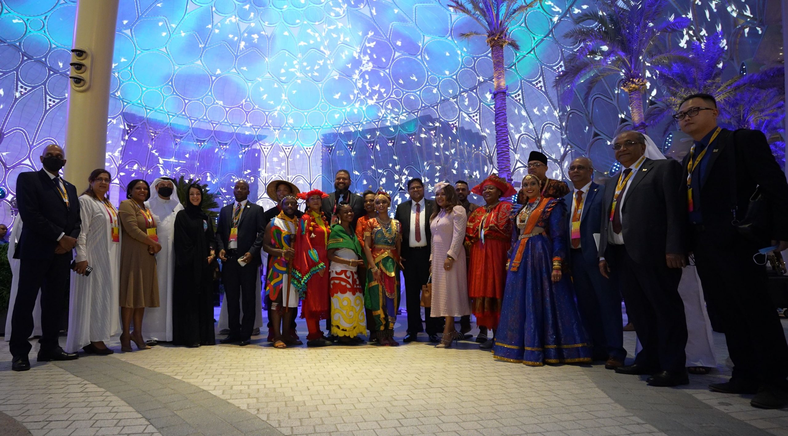 (Foto: Delegatie van president Santokhi met de cast en crew van Suriname in Dubai en de delegatie van de Verenigde Arabische Emiraten.)