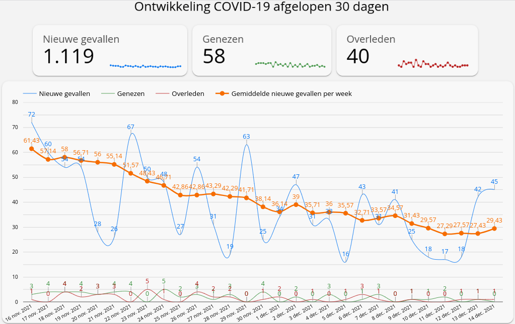 Op Intensive Care Units van de ziekenhuizen liggen dinsdag 12 patiënten en in totaal liggen 14 personen met het virus in een ziekenhuis, 5 minder dan maandag. De BOG Covid-19 dashboard toont 14 december drie personen in isolatie.