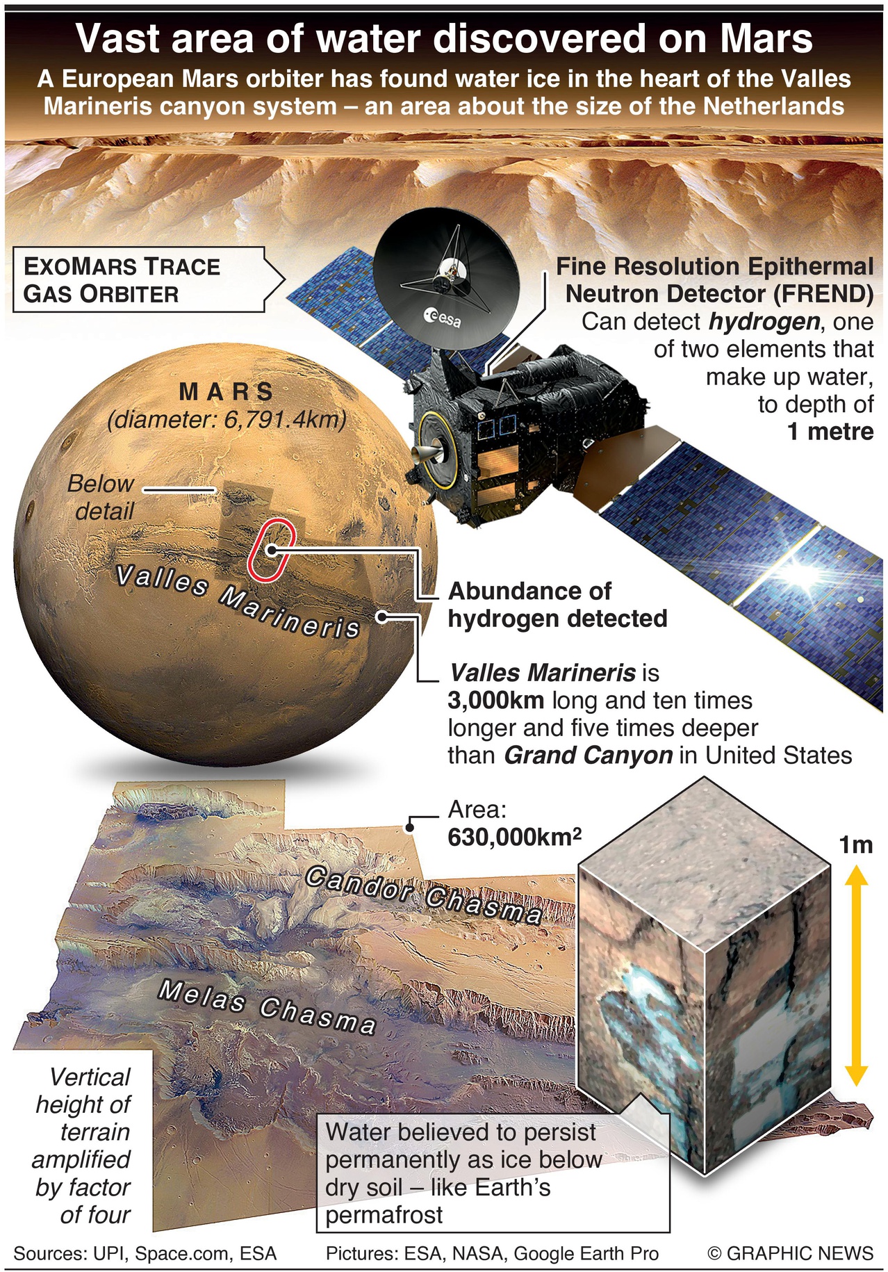 Nu, 50 jaar later, heeft de ExoMars Trace Gas Orbiter van de ESA enorme hoeveelheden waterstof geĂŻdentificeerd in de bovenste oppervlaktelagen van de bodem in het midden van de kloof.