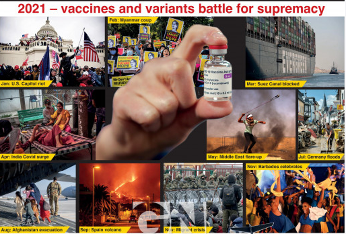 Een overzicht van belangrijke nieuwsberichten in 2021 omvat de aanhoudende pandemie van het coronavirus, de rellen in het Capitool in de VS, de militaire staatsgreep in Myanmar, de verbluffend snelle Taliban-overname in Afghanistan en de toename van weergerelateerde rampen over de hele wereld.