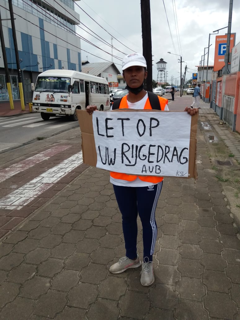 Vrijwilligers van het Korps Suriname Verkeersvrijwilligers hielden maandagmorgen een bewustwordingsactie op de J.A. Pengelstraat om autobestuurders er nog eens op te wijzen dat hun rijgedrag levens kan redden. Nu wij tegen het einde van het jaar zijn benadrukt de organisatie nogmaals het belang van veiligheid op de weg.