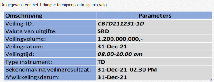 Overigens, de CBvS maakte later donderdag bekend, dat in het kader van haar Open Markt Operaties (OMO) op vrijdag 31 december een termijndeposito (TD) met een looptijd van een dag als “fine-tune” instrument geveild zal worden. Dit instrument wordt onder dezelfde voorwaarden van het 1-weeks termijndeposito geveild teneinde de vastgestelde doelstelling van de basisgeldhoeveelheid te behalen. De looptijd van deze TD is één dag en vervalt namelijk op zaterdag 1 januari 2022. De wekelijkse veilingen van de zevendaagse termijndeposito’s vinden normaal plaats op de woensdag.