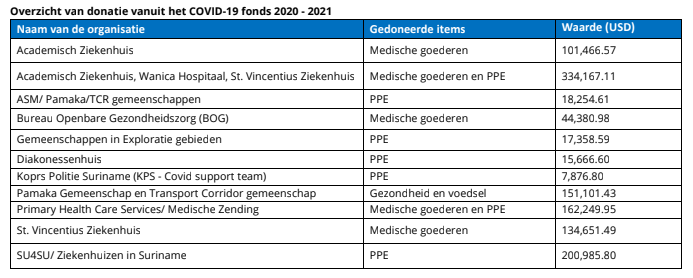 Om Suriname te helpen de pandemie te doorstaan heeft Newmont tot nu toe ongeveer USD 2.000.000 gedoneerd en toegezegd aan gezondheidsautoriteiten en medische instellingen in Paramaribo en omliggende gemeenschappen. Sinds het begin van de pandemie zijn deze donaties via ons Covid-19 Ondersteuningsfonds verstrekt. Dit Fonds is ingesteld ter ondersteuning van inspanningen om een van de grootste wereldwijde gezondheidscrises die de wereld ooit heeft gezien te overwinnen.