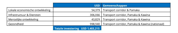 Deze gemeenschapsinvesteringen zijn bedoeld om constructieve, langdurige relaties met belanghebbenden op te bouwen die gebaseerd zijn op vertrouwen en respect om de gedeelde waarden van de activiteiten van de Newmont-site in Suriname te maximaliseren.