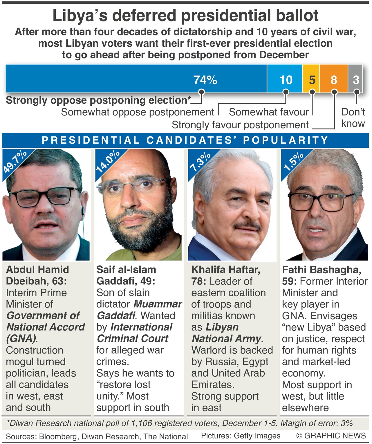 Na meer dan vier decennia van dictatuur en 10 jaar burgeroorlog willen de meeste Libische kiezers dat hun allereerste presidentsverkiezingen doorgaan nadat ze zijn uitgesteld tot december. Het Libische parlement, het Huis van Afgevaardigden in de oostelijke stad Tobruk, kwam op 3 januari bijeen om te beslissen over het voorstel van de Nationale Verkiezingscommissie om op 24 januari de eerste ronde te houden. Volgens het voorstel zouden de presidentsverkiezingen worden gevolgd door parlementsverkiezingen de volgende maand, op 15 februari.