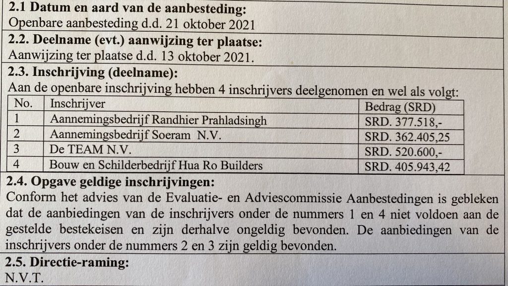 “Terwijl het ministerie van Openbare Werken in Nickerie een afdeling Technische Dienst heeft met timmerlieden, alles, er zijn bijna 300 mensen die zijn ondergebracht, timmerlieden, zogenaamd timmerlieden, ik weet het niet. En men gaat een inschrijving houden ondanks dat ze deze mensen hebben die het zelf kunnen bouwen, gaan ze een inschrijving houden om een toilet te bouwen. En iemand in Paramaribo, dichtbij de minister, krijgt dit werk voor SRD 520.000. De Nickeriaanse aannemers die zijn buiten gelaten, die veel goedkoper waren, zo tussen de SRD 200-250.000”, stelt Doekhie.