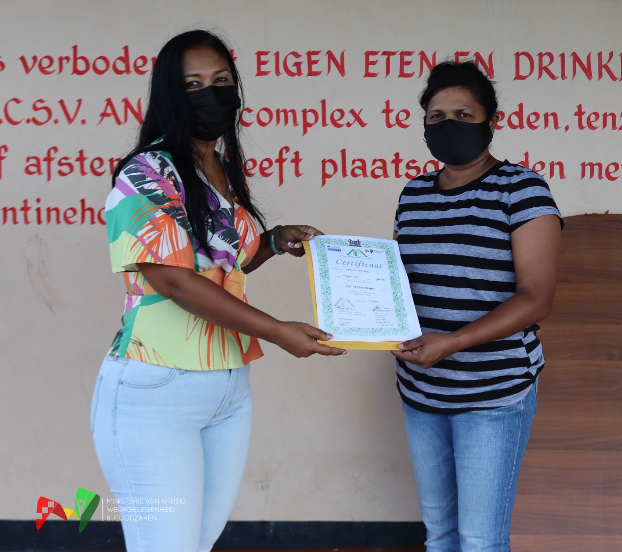 Directrice Joyce Lapar van de SAO heeft de cursisten aangemoedigd om zich te blijven inzetten. De geslaagden van de training textiele werkvormen worden voorzien van een naaimachine en de geslaagden van de gawasa training een toolkit om hetgeen aangeleerd is verder voort te zetten.
