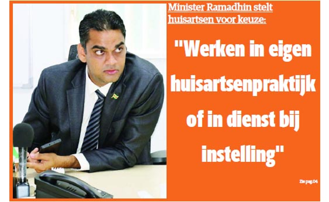 Minister Amar Ramadhin van Volksgezondheid (VG) heeft in een schrijven aan de Vereniging van Medici in Suriname (VMS) laten weten, dat huisartsen met een geldige vestigingsvergunning voor de uitoefening van het beroep van arts op de eigen Huisartsenpraktijk (HA), niet tegelijkertijd bij een andere instelling in dienst kunnen zijn om hun beroep uit te oefenen. Huisartsen die ervoor kiezen om op de eigen HA praktijk het beroep wensen uit te oefenen, dienen uiterlijk 1 februari 2022 aan het ministerie van VG een ontslagbrief te overleggen waaruit blijkt, dat ze niet meer verbonden zijn aan een andere instelling.