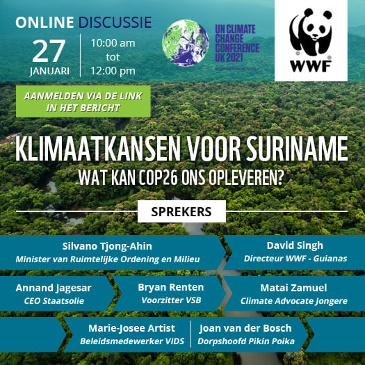 Volgens het WWF gaan donderdag zeven boeiende sprekers met elkaar in discussie over “Klimaatkansen voor Suriname”. Vragen uit het publiek worden ook live beantwoord. Keynote speaker is minister Silvano Tjong-Ahin van Ruimtelijke Ordening en Milieu. Hij was zelf op COP26 in Glasgow aanwezig.