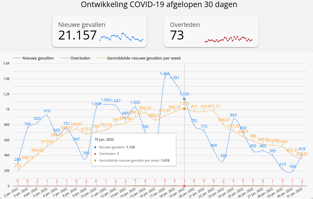 Maandag 31 januari zijn 418 personen positief op Covid-19 getest uit een totaal van 1.036 uitgevoerde testen. Dat waren afgelopen woensdag 459 personen, donderdag 460, vrijdag 395, zaterdag 219 en zondag 189.