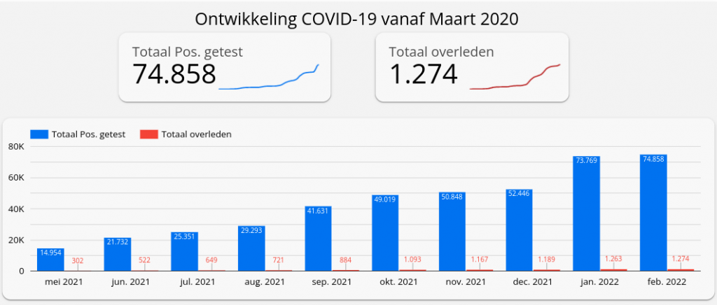 Drie patiënten zijn donderdag aan het virus overleden, waardoor het totaal aantal aan het virus overleden personen – sinds het begin van de pandemie medio maart 2020 – nu 1.274 bedraagt, zo is te zien op de website van het Bureau voor Openbare Gezondheidszorg (BOG) waar een zogenoemd dashboard dagelijks rond elf uur ‘s avonds de Covid-cijfers publiceert.