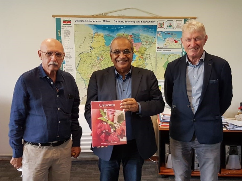 Foto: Victor Oliveira (koesoewedeskundige), LVV-minister Parmanand Sewdien en Tinus Vernooij (potentiële investeerder).