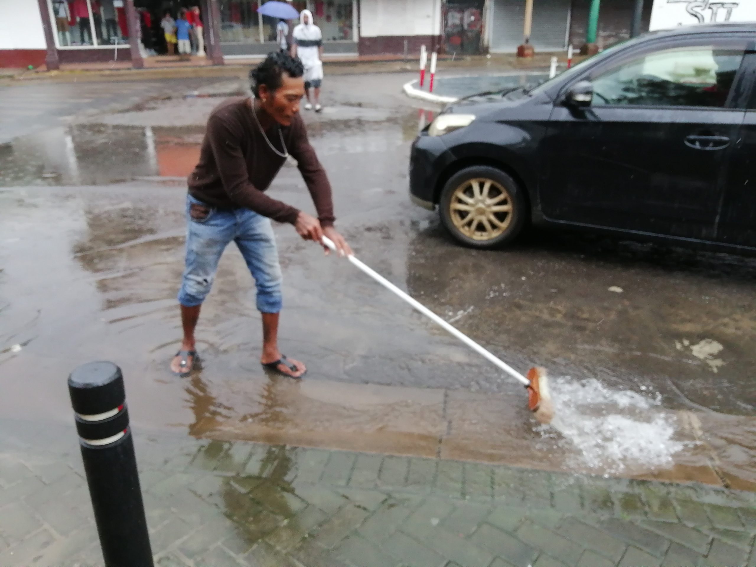 Afgelopen zaterdag was er sprake van aanhoudende regenbuien. Een opvallend moment was een man aan de Heiligenweg die met een bezem in de regen het water aan het âwegvegenâ was. De man zei, dat anders het water blijft zitten. Zijn kameraad was het met hem eens.