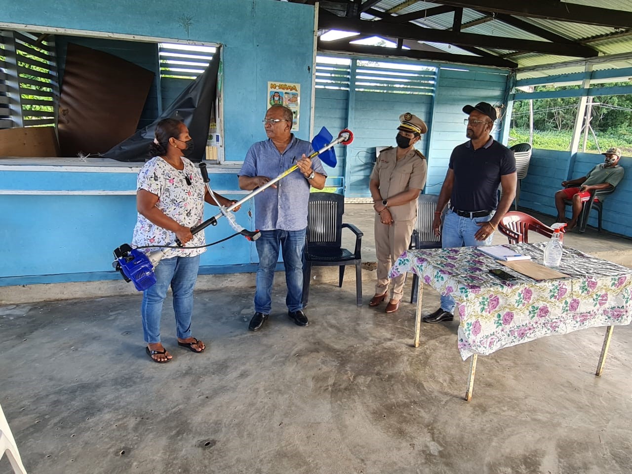Elk van de dorpen kreeg twee brushcutters (zie foto) en groentezaden gedoneerd door de bewindsman en de districtscommissaris. De dorpsgemeenschappen zijn verheugd, dat er mogelijkheden worden bekeken om landbouw en veeteelt verder te verbeteren en te stimuleren. De delegatie heeft woensdag ook een bezoek gebracht aan de dorpen Tapoeripa en Donderskamp.