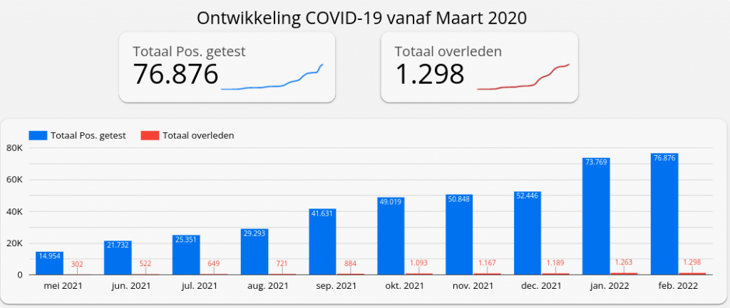 Vier patiënten zijn vrijdag aan het virus overleden, waardoor het totaal aantal aan het virus overleden personen – sinds het begin van de pandemie medio maart 2020 – nu 1.298 bedraagt, zo is te zien op de website van het Bureau voor Openbare Gezondheidszorg (BOG) waar een zogenoemd dashboard dagelijks rond elf uur ‘s avonds de Covid-cijfers publiceert.