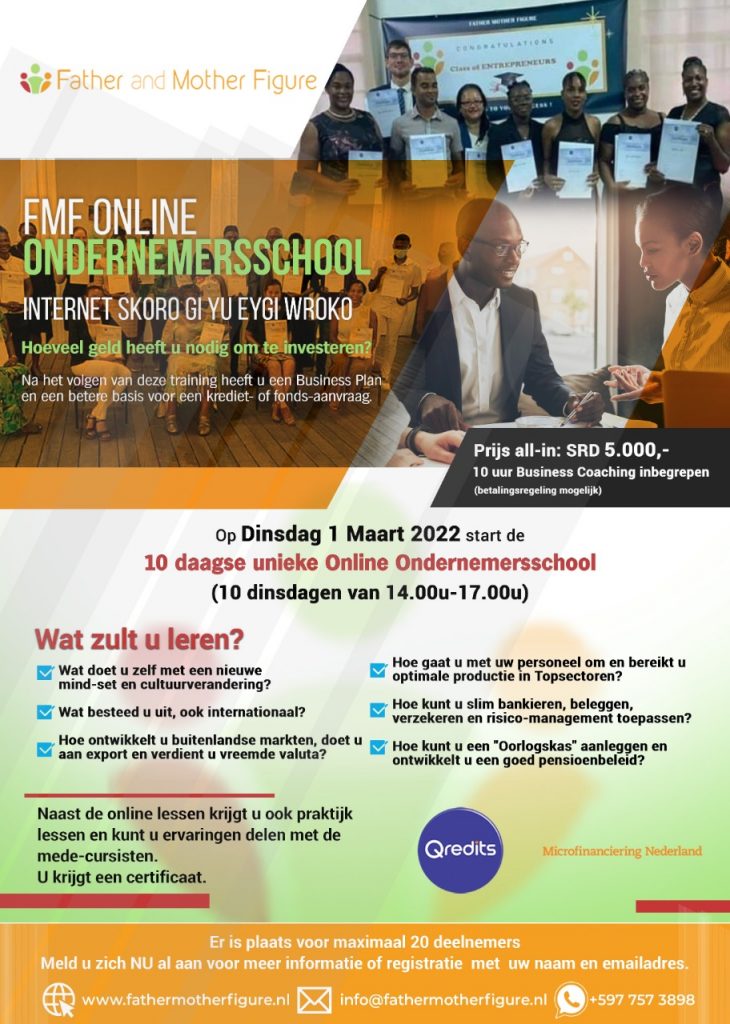 Stichting Father Mother Figure Suriname FMF timmert al sinds 2016 hard aan de weg in Suriname op het gebied van coaching, training en matching van studenten (vanaf 8 jaar), entrepreneurs en professionals. FMF werkt ook volgens de driehoek: kind-ouder-leerkracht.