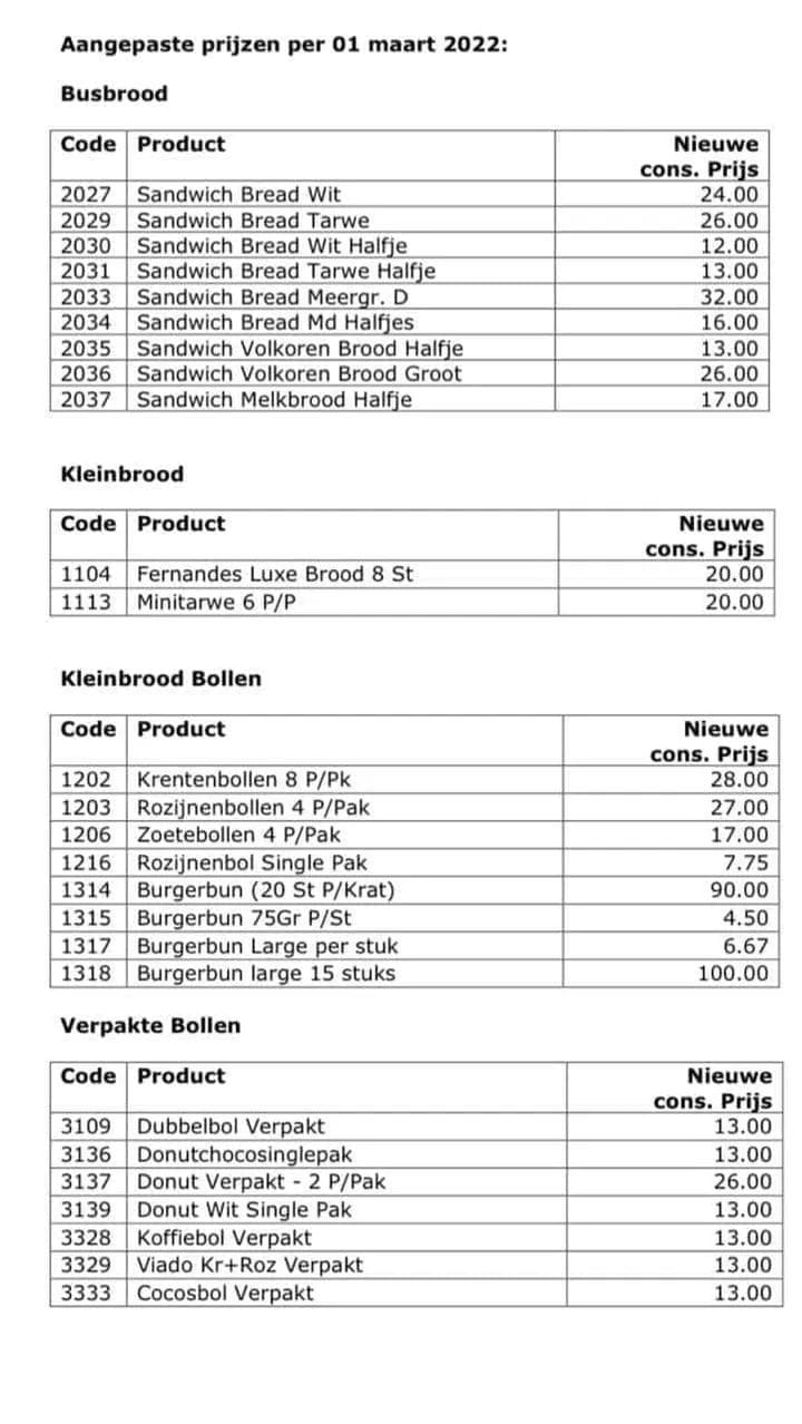 Op social media circuleerde dinsdagmorgen een lijst met aangepaste tarieven voor de broodproducten van Fernandes Bakkerij. De afdeling Marketing van het bedrijf bevestigde de berichtgeving. De reacties online bleven niet uit. Weinig mensen kunnen begrip opbrengen voor de aanpassingen. Hoewel er wel mensen zijn die reageren met “gewoon hard werken en blijven bezuinigen” zijn er velen die zich in andere bewoordingen uiten.
