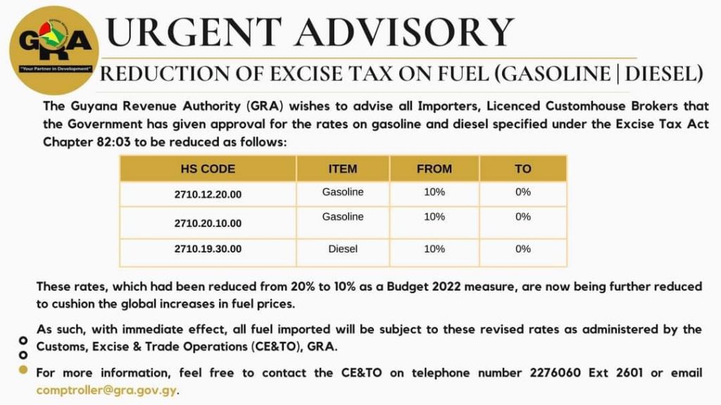 De Guyana Revenue Authority (GRA) – de Belastingdienst – heeft woensdag aangekondigd dat de verlaging naar 0% onmiddellijk van kracht zou worden om de wereldwijde stijgingen van de brandstofprijzen op te vangen.