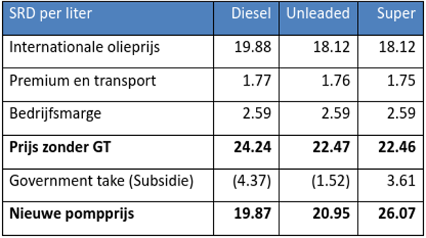 De subsidie per liter bedraagt SRD 4,37 voor diesel en SRD 1,52 voor unleaded. Deze subsidie is equivalent aan een negatieve government take. Op super wordt er geen subsidie gegeven.