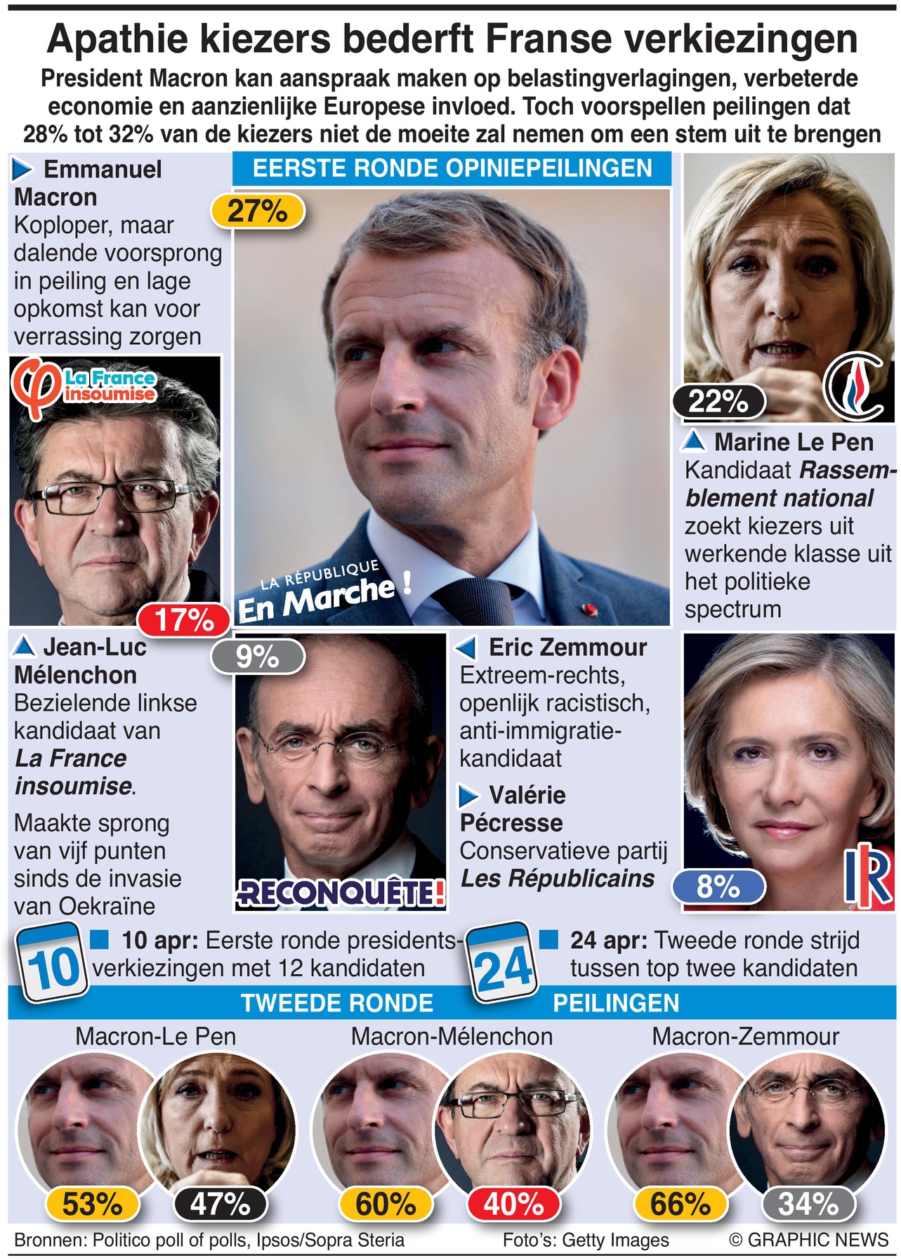 De laatste Politico Poll poll plaatst Macron aan de leiding met 27 procent, gevolgd door Marine Le Pen, de extreemrechtse leidster van de National Rally, met 22 procent. De extreemlinkse Jean-Luc Mélenchon staat op 17 procent.