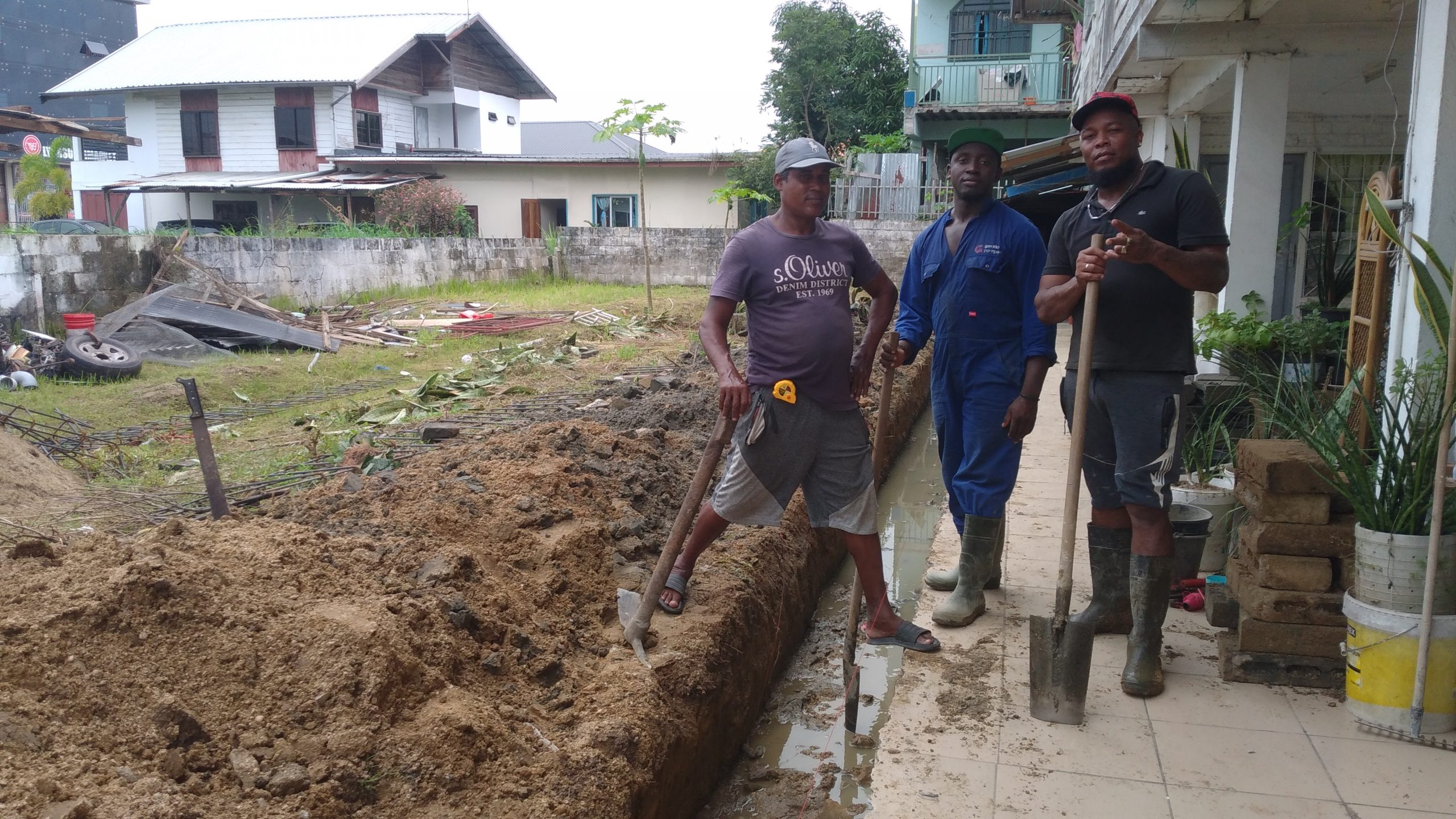 Dagblad Suriname kwam een trio eerste klasse bouwvakkers bestaande uit Dimitri Promes, Ronald Lachman en Mitchell Haabo tegen. Het drietal zwoegde op Goede Vrijdag van ‘s morgens vroeg tot laat in de middag in wisselvallig weer.