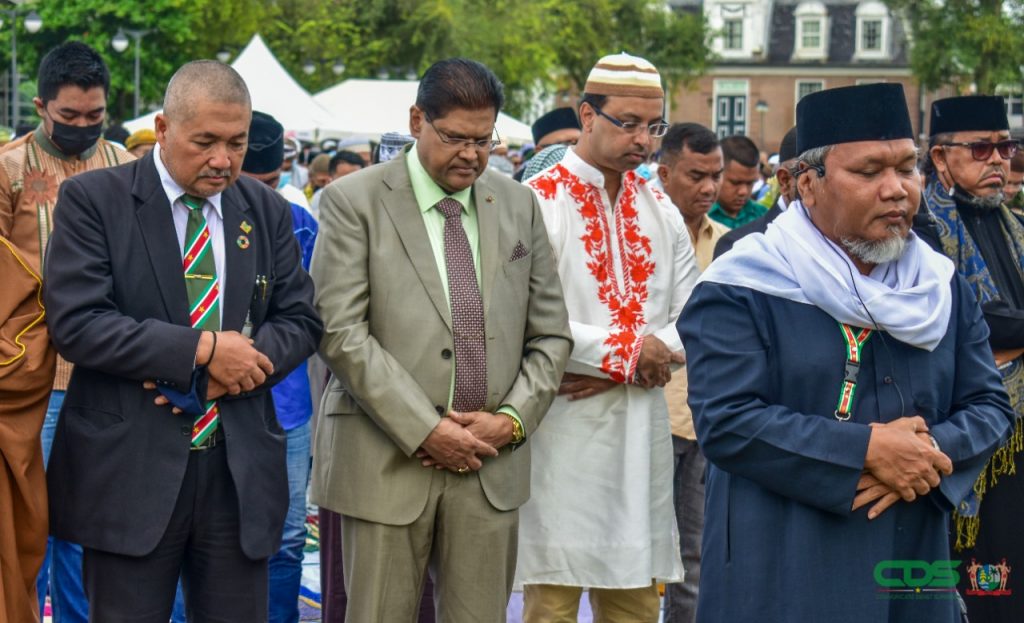 “Als president van het land, doe ik een beroep op u allen, om broederschap en barmhartigheid te omarmen en te werken aan de vooruitgang en welvaart van ons land. Door samen te werken en wederzijds begrip te bevorderen, wijzen we de weg naar een betere toekomst voor iedereen, ongeacht ras, godsdienst en levensovertuiging”. Dit zei president Chandrikapersad Santokhi maandag 2 mei ter gelegenheid van Idul-Fitre, op het Onafhankelijkheidsplein. Het Idul-Fitre feest markeert het einde van de Ramadan; de vastenmaand van de moslims.