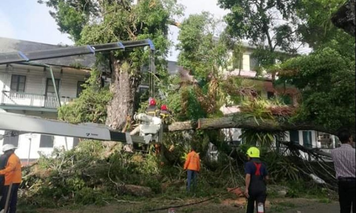 Binnen een maand zijn twee oude mahoniebomen omgevallen in de binnenstad van Paramaribo. Op 7 mei viel een boom om in de Keizerstraat en op 22 mei in de Heerenstraat. Er deden zich geen persoonlijke ongelukken voor in beide gevallen.