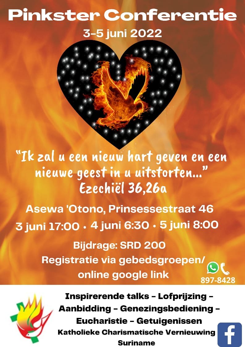 De Katholieke Charismatische Vernieuwing Suriname (KCV), een werkarm binnen de Rooms Katholieke kerk die bijdraagt aan het bevorderen van de dienstverlening binnen de kerk, heeft voor 3-5 juni 2022, haar āPinksterconferentieā op het programma staan.Ā