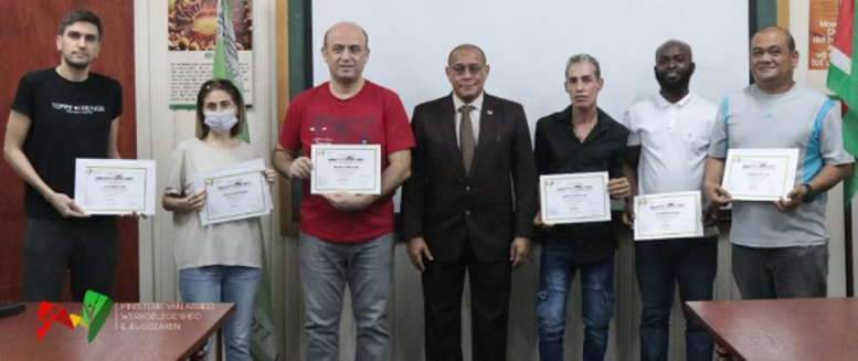 Negen migrantenarbeiders hebben met succes de test Basis Taalkennis en Samenleving doorlopen en hebben daarvoor dinsdag 24 mei een certificaat in ontvangst mogen nemen uit handen van de minister van de Arbeid Werkgelegenheid & Jeugdzaken, Steven Mac Andrew.