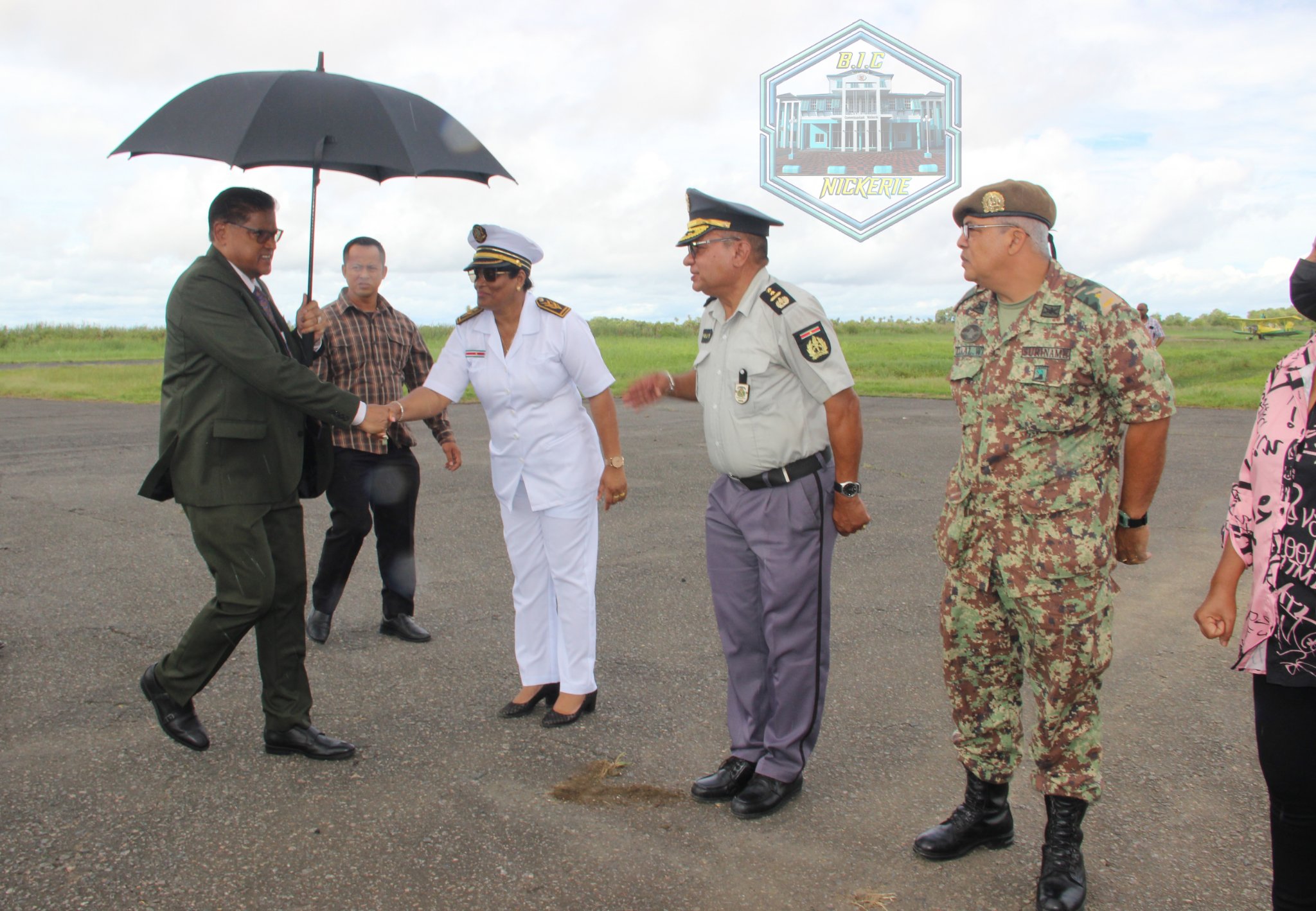 De president werd bij aankomst welkom geheten door districtscommissaris Senrita Gobardhan van Nickerie, enkele Assembleeleden alsook de Bestuursdienst van Nickerie.