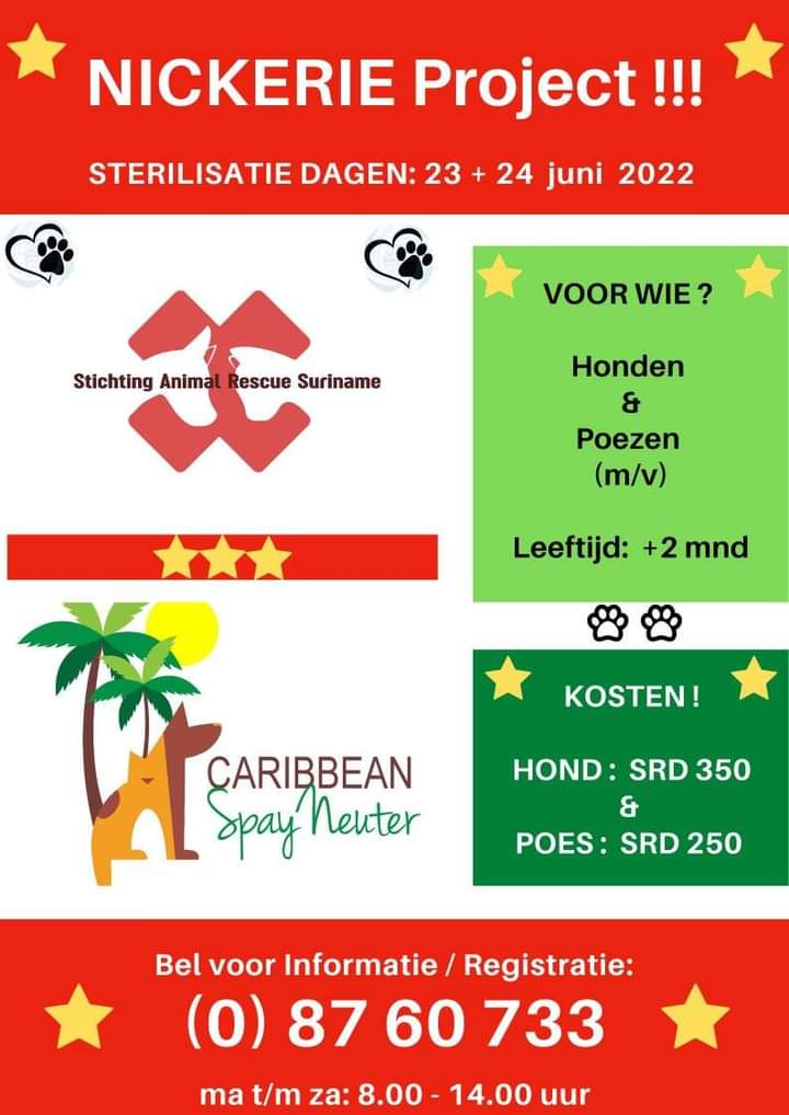 Stichting Animal Rescue Suriname organiseert in samenwerking met Caribbean Spay Neuter Foundation uit de Verenigde Staten, een sterilisatieproject voor honden en poezen. Het gaat om een duo-project waarbij op twee dagen (23 en 24 juni) zal worden geopereerd te Nieuw-Nickerie en daarna gedurende twee dagen in Paramaribo.