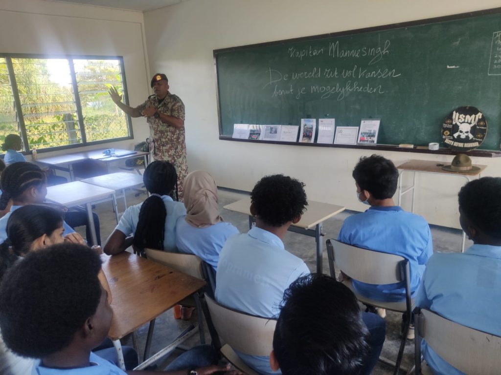 Kapitein Shyam Manniesingh van de afdeling Civiel Militaire relaties van het Nationaal Leger heeft dinsdagochtend een motivatiesessie gehouden te VOJ Meerzorg. Het thema van de motivatiesessie was: “De wereld zit vol kansen, benut je mogelijkheden”. “We moeten elk jaar overgaan en Suriname uit de financiële blubber halen. Een gezamenlijk gevoel van trots, daar wordt een land beter van”, stelt Manniesingh.