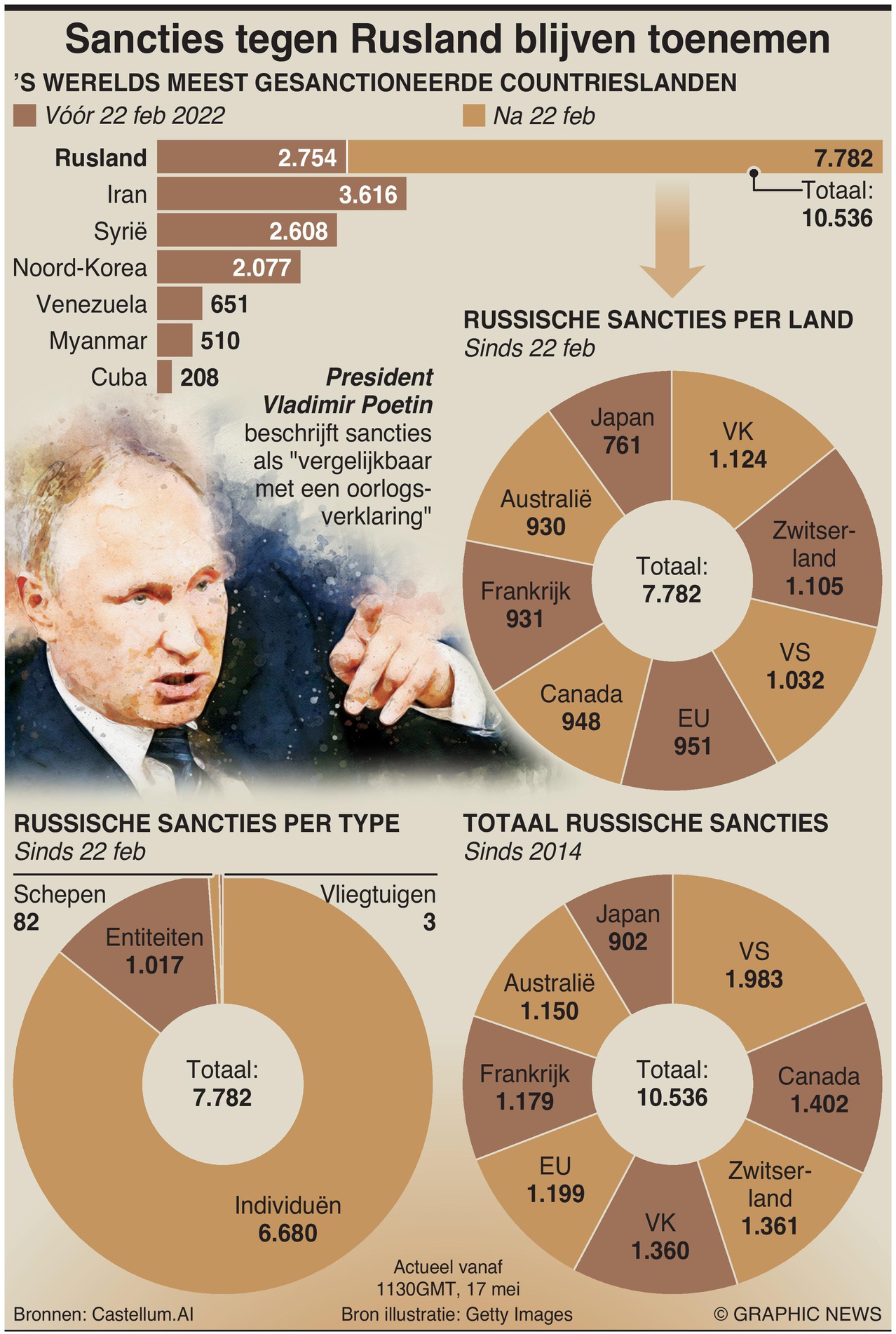 Vóór Poetins onverstandige invasie van Oekraïne stond Rusland op de tweede plaats met 2.754 sancties.