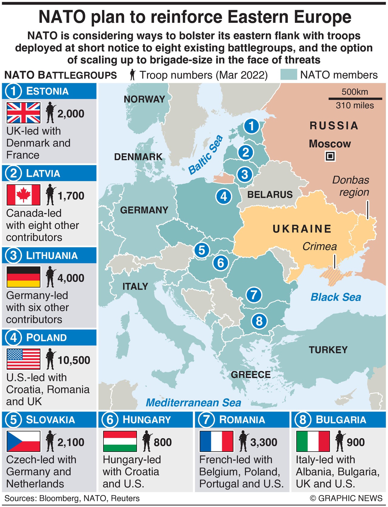 De NAVO overweegt manieren om haar oostelijke flank te versterken met troepen die op korte termijn worden ingezet voor acht bestaande gevechtsgroepen, en de mogelijkheid om op te schalen naar brigade-omvang in het licht van dreigingen.