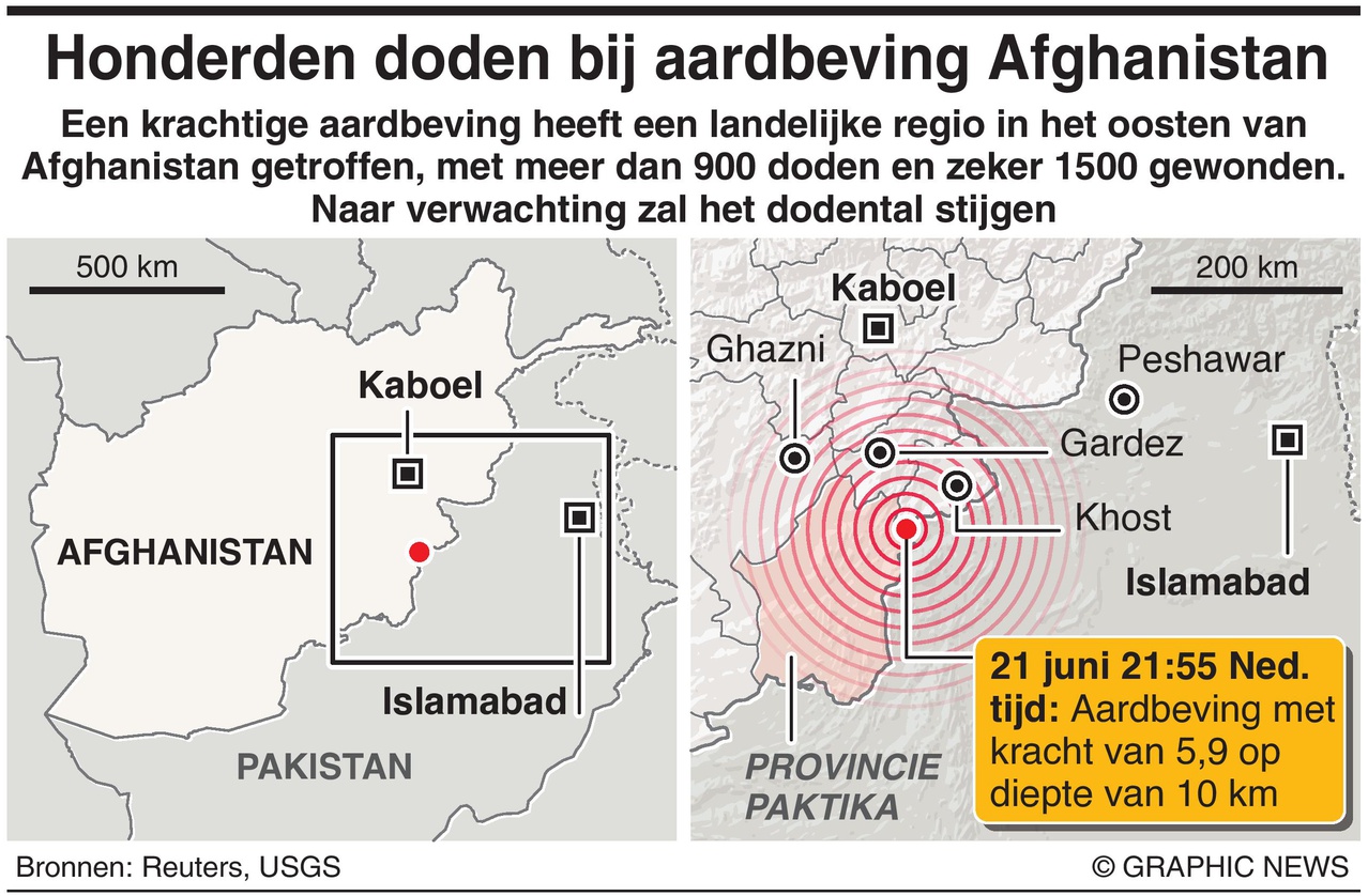 Een aardbeving met een kracht van 6,1 heeft in het oosten van Afghanistan aan vele honderden mensen het leven gekost. Volgens een staatspersbureau is het dodental opgelopen tot meer dan 1000. Meer dan 1500 mensen zouden gewond zijn geraakt.