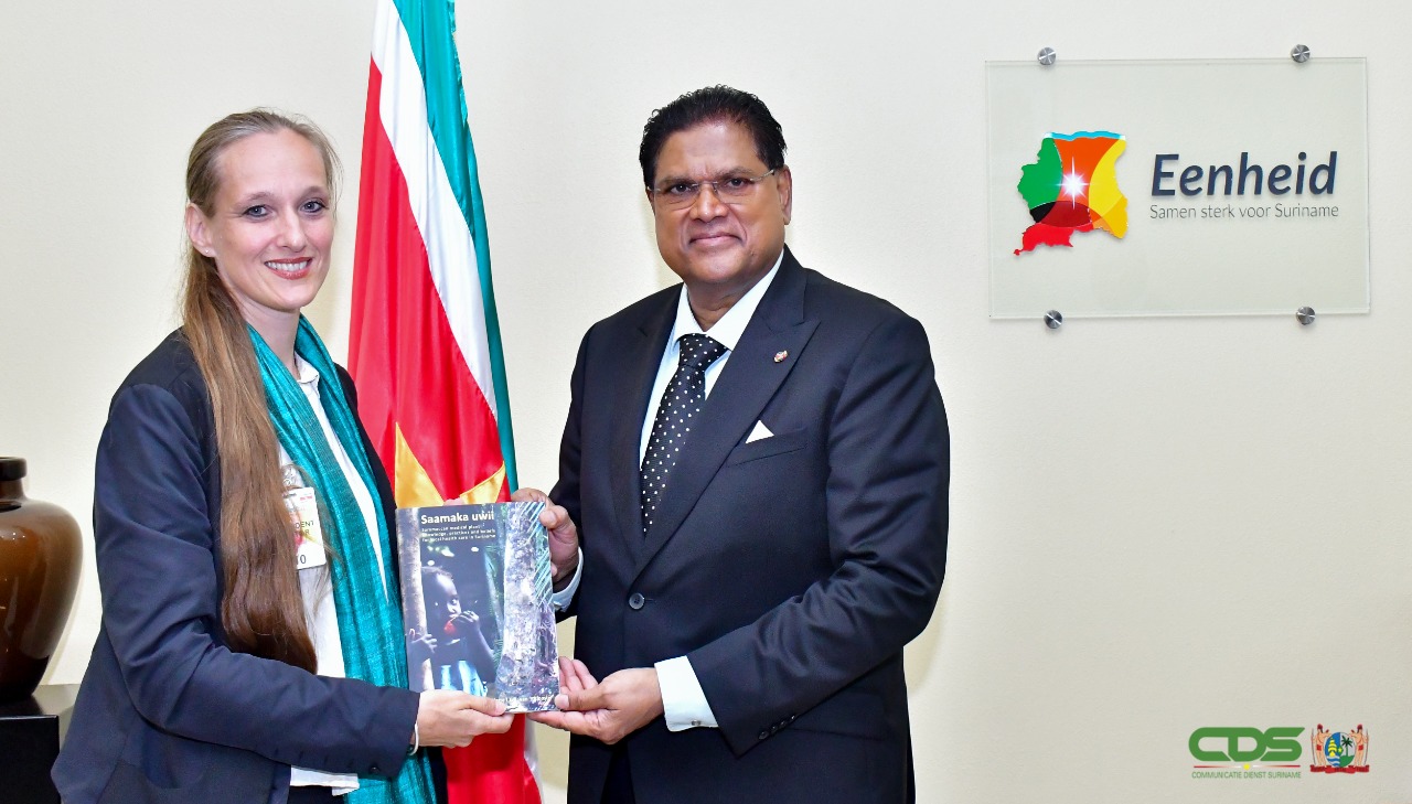 President Chandrikapersad Santokhi heeft zaterdag een exemplaar van het proefschrift “Saamaka uwii: Saramakaanse medische plantenkennis, praktijken en overtuigingen voor lokale gezondheidszorg in Suriname” in ontvangst genomen uit handen van dr. Charlotte van ’t Klooster.