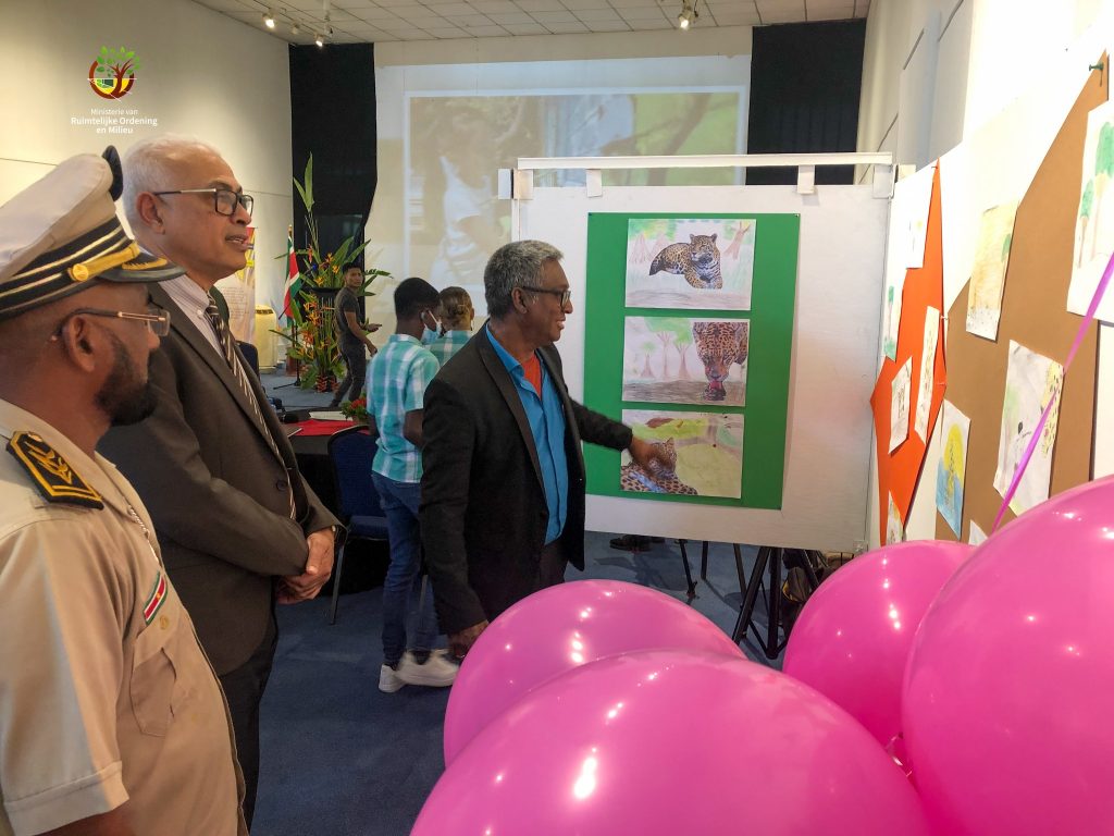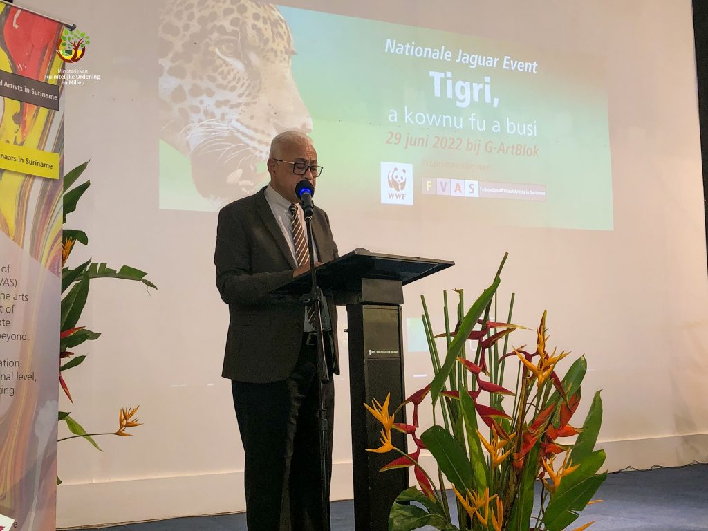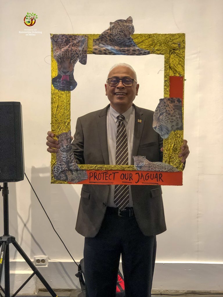 Minister Silvano Tjong-Ahin van het ministerie van Ruimtelijke Ordening en Milieu, ROM,, heeft woensdag de National Jaguar Exhibition – georganiseerd door het WWF Guianas en de Federation of Visual Artists in Suriname (FVAS) – bijgewoond namens president Chandrikapersad Santokhi in het G-Artblok gebouw.