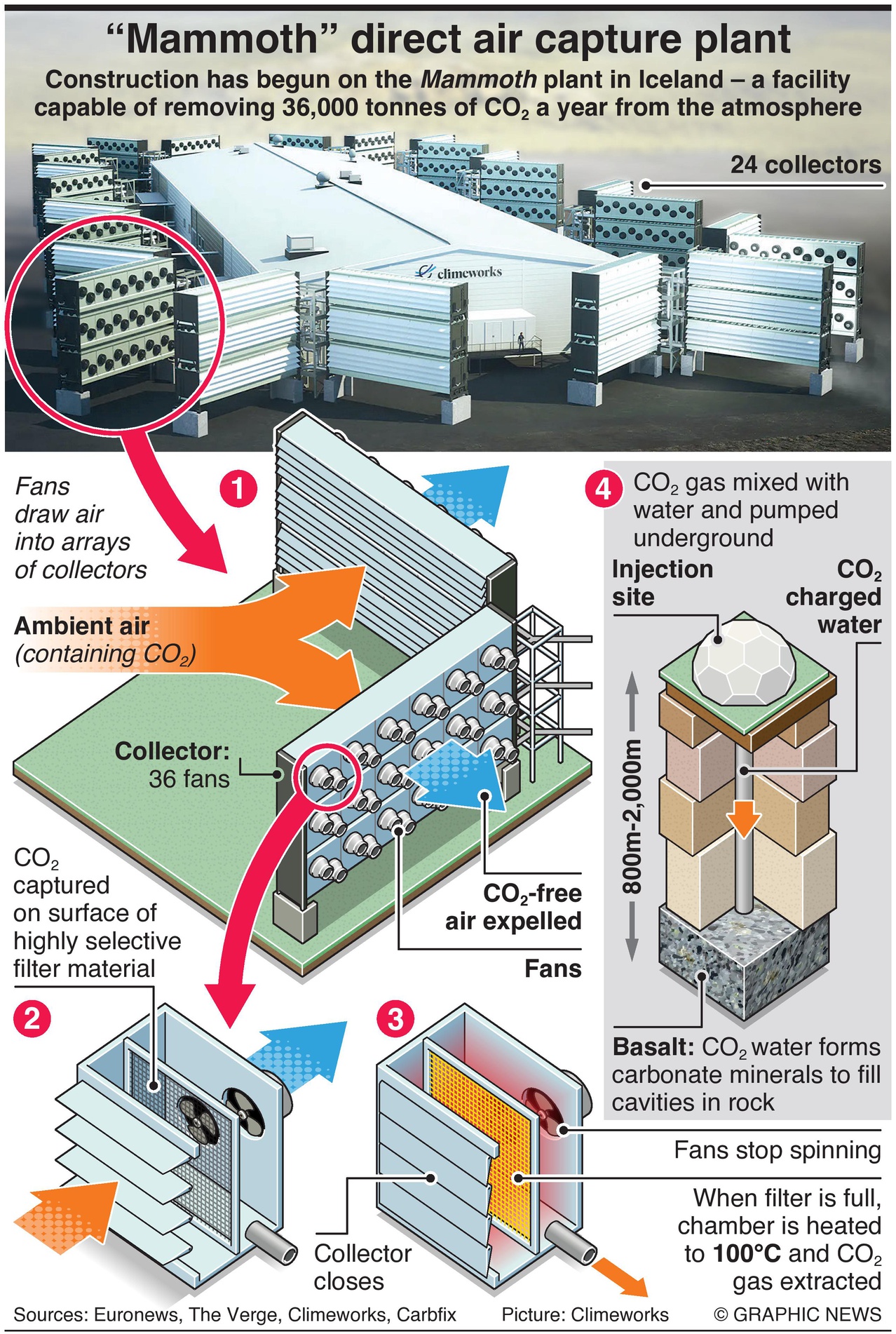 De nieuwe “Mammoth” centrale zal ongeveer 80 grote blokken ventilatoren en filters bevatten die de lucht aanzuigen en de CO2 eruit halen, die vervolgens door het IJslandse koolstofopslagbedrijf Carbfix met water wordt vermengd en ondergronds wordt geïnjecteerd, waar het door een chemische reactie in gesteente verandert. Het proces zal worden aangedreven door een bijna geothermische energiecentrale.