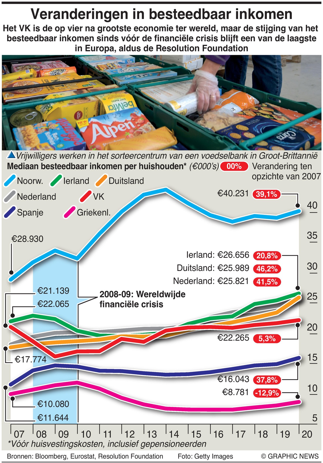 Het VK is de op vier na grootste wereldeconomie, maar de verandering in het beschikbare inkomen sinds vóór de financiële crisis blijft een van de laagste in Europa, waarschuwt de Resolution Foundation.