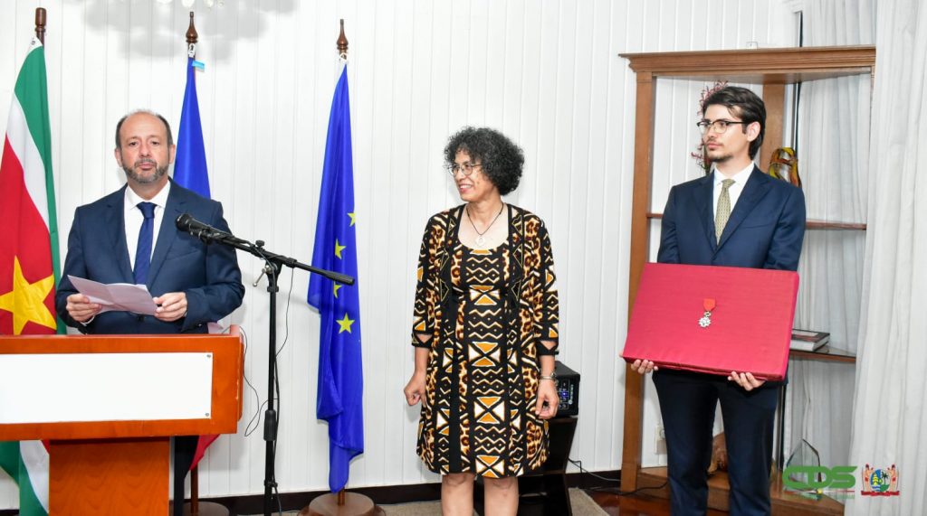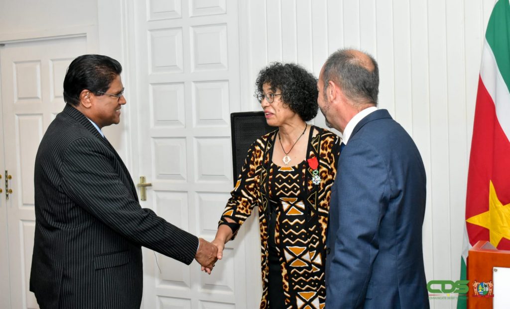 Monique Pool, oprichter van Green Heritage Fund Suriname en nationaal en internationaal bekend vanwege haar inzet voor de bescherming van onder andere luiaards en de aandacht die zij vraagt voor dolfijnen in Surinaamse wateren, ontving vrijdag 8 juli een bijzondere erkenning, de medaille “Chevalier de la Légion d´Honneur, van de Republiek Frankrijk.