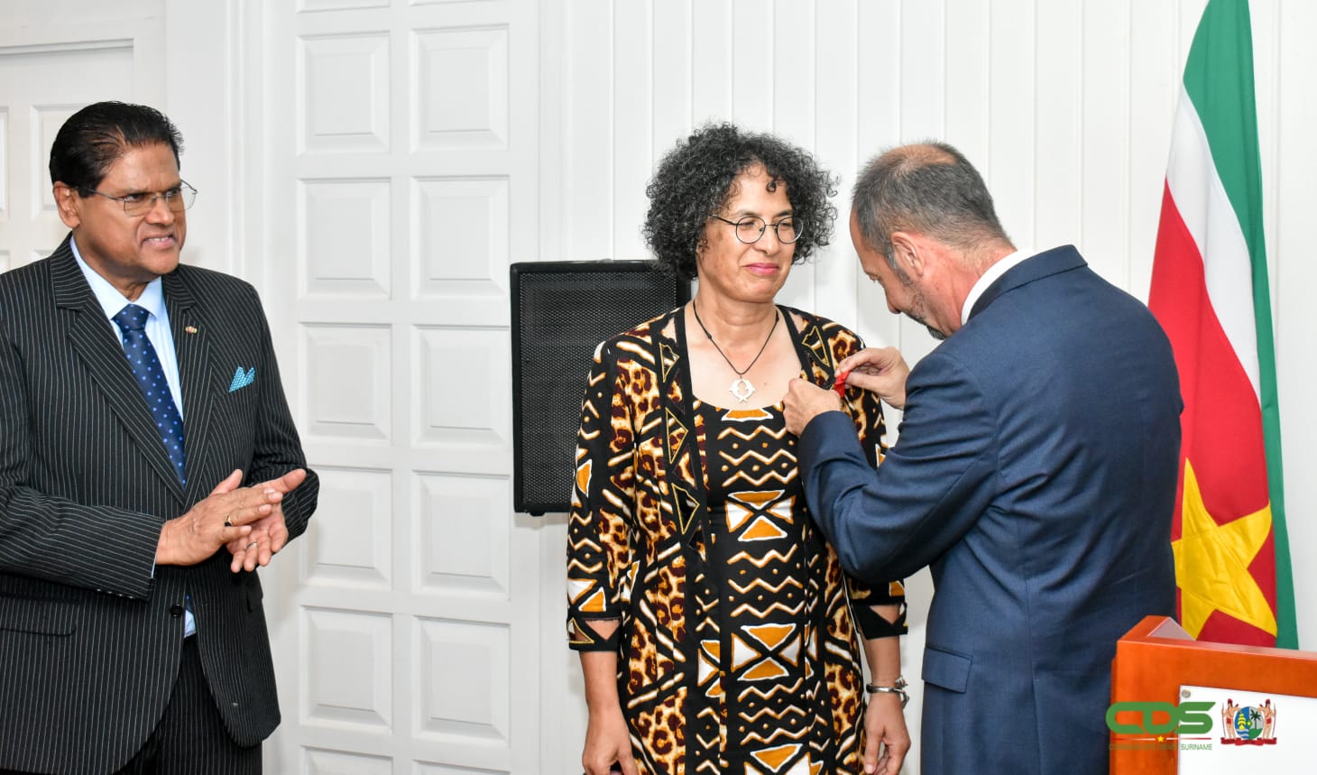 Monique Pool, oprichter van Green Heritage Fund Suriname en nationaal en internationaal bekend vanwege haar inzet voor de bescherming van onder andere luiaards en de aandacht die zij vraagt voor dolfijnen in de Surinaamse wateren, ontving vrijdag 8 juli een bijzondere erkenning, de medaille “Chevalier de la LĂ©gion dÂŽHonneur, van de Republiek Frankrijk.