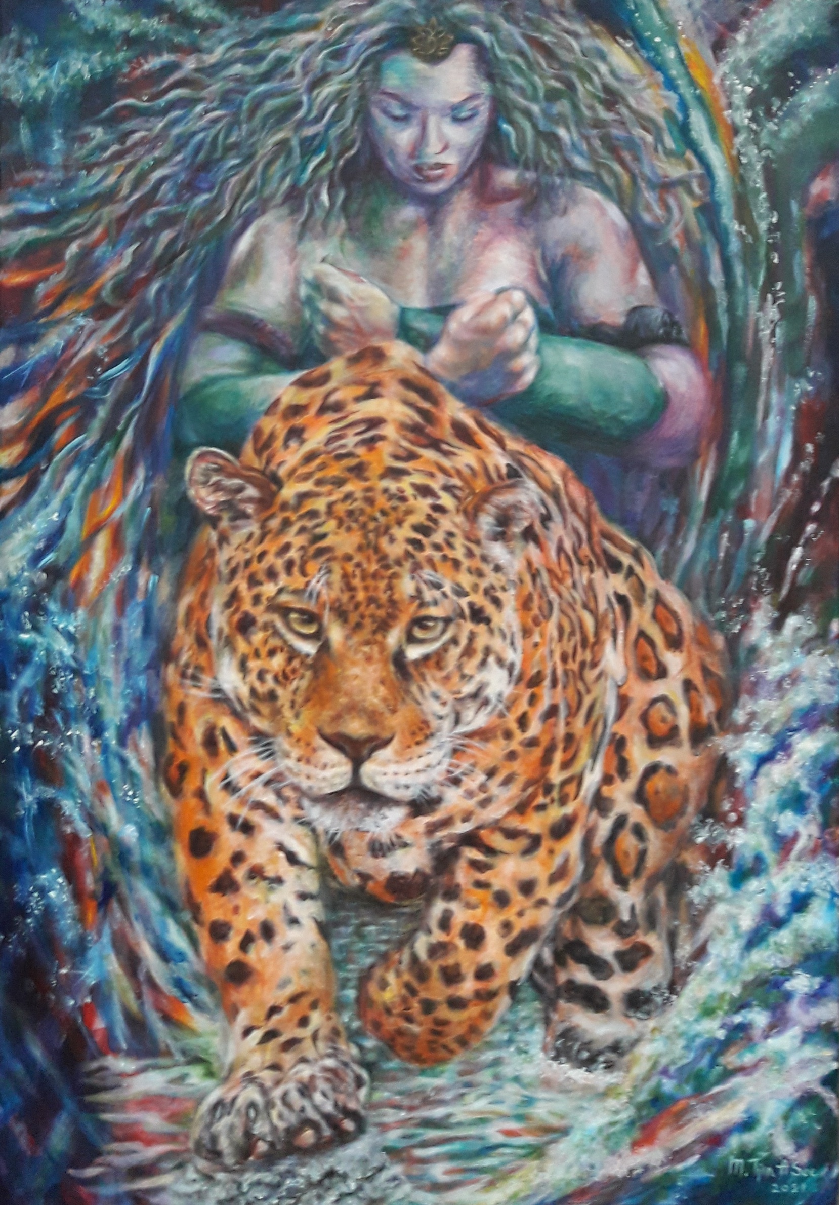 Manuela Tjin A Soe toont symbolisch realisme op canvas en hardboard met een nationalistische tint in ‘Together we thrive’ en ‘Çhoose Freedom’ terwijl ‘Áwakened’ met een jaguar, het ontwaakte bewustzijn van de hedendaagse vrouw probeert weer te geven.