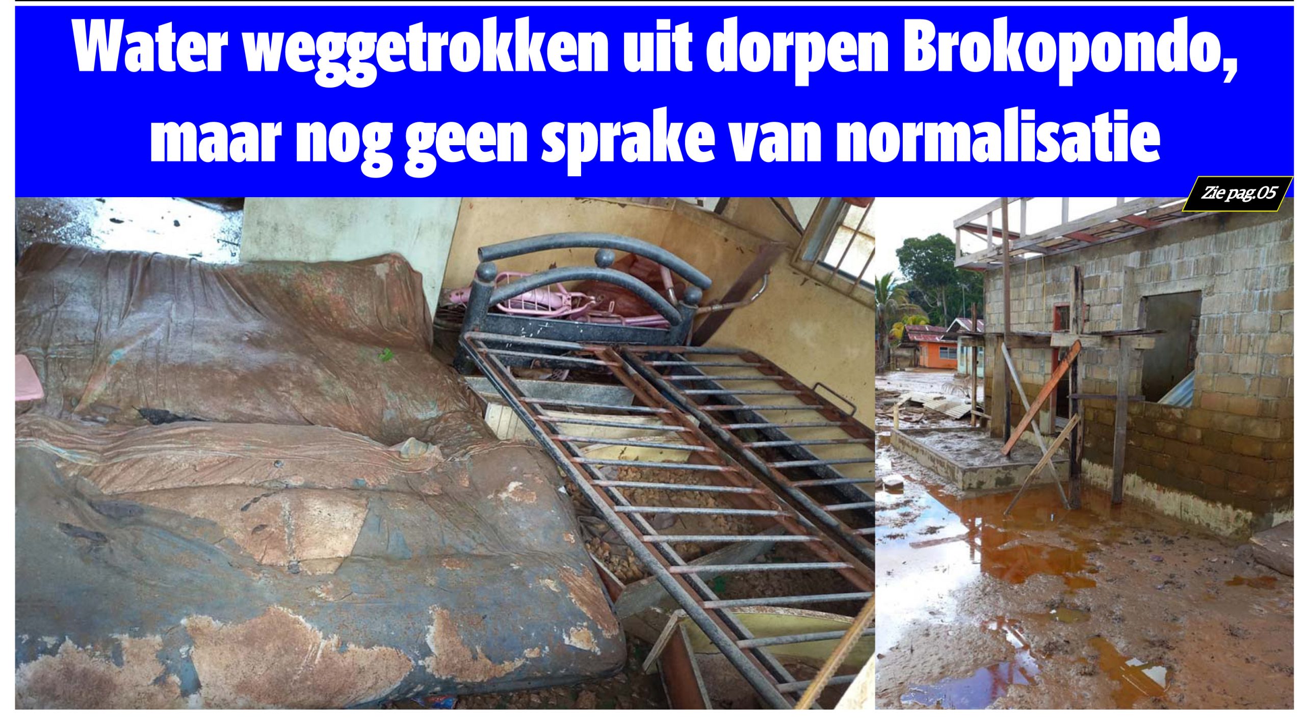 (Bijschrift foto’s: Nu het water in de ondergelopen dorpen in Brokopondo sedert twee weken is weggetrokken, is duidelijk te zien welke ravage het heeft aangericht aan woningen. Bijgaande foto’s gemaakt in het dorp Nw. LombĂ© laat de aangerichte schade duidelijk zien. Woningen en inboedel zitten onder de “laba-laba” (waterig modder). Pas na een grondige schoonmaak zal men de daadwerkelijke schade kunnen opmaken. De foto van de in aanbouw zijnde woning laat duidelijk zien, hoe hoog het water heeft gestaan.)