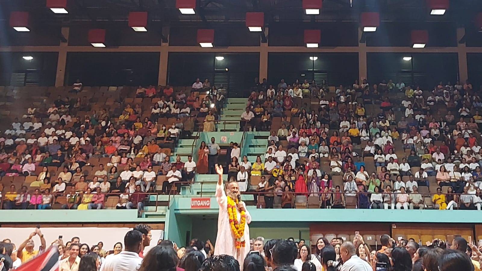 De spirituele leider Gurudev Sri Sri Ravi Shankar heeft donderdagavond een groot aantal toeschouwers en aanhangers toegesproken in het Nationaal Indoor Stadion. Eerder was hij ook bij een persconferentie en op het presidentieel paleis.