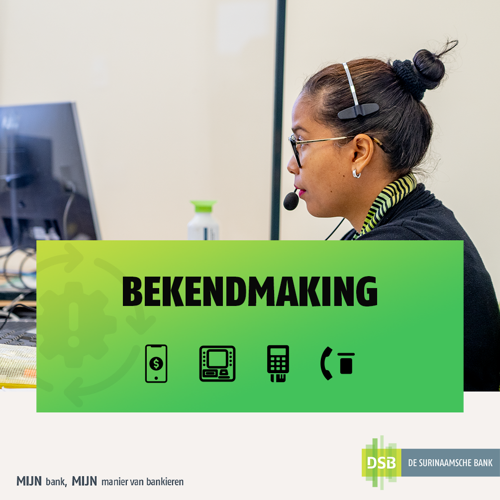 De Surinaamsche Bank, DSB, heeft bekendgemaakt dat geen enkele van haar diensten zondag 17 juli beschikbaar zijn voor haar cliënten. De Bank stelt, dat zij continu werkt aan de verbetering van haar dienstverlening. Daartoe vindt zondag van middernacht tot negen uur in de avond een “noodzakelijke update plaats van ons banksysteem”.